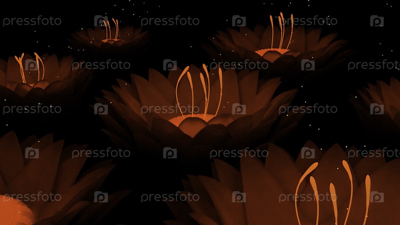 Ярко-зеленые и красные цветы в абстракции.Дизайн.Яркие почки с блестящими крыльцами открываются и закрываются назад