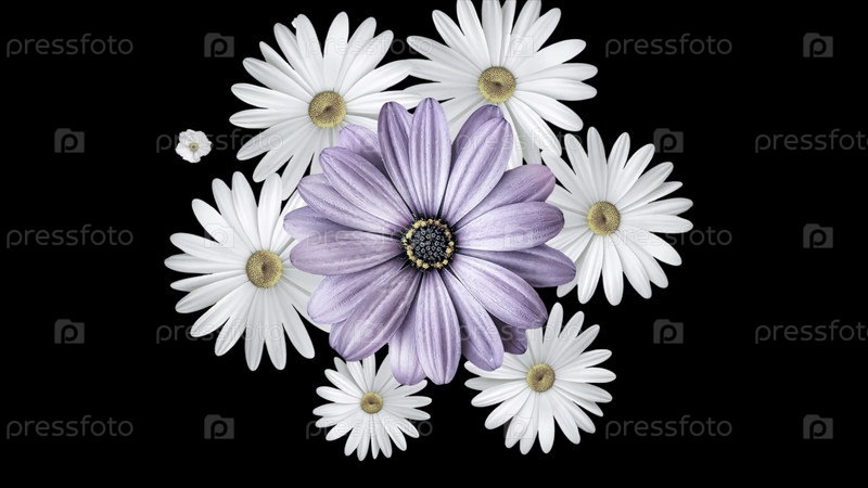 Анимация букета белых маргариток, движущихся вокруг и образующих круг с большим фиолетовым цветом в центре. черный фон