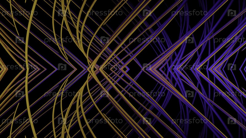 Абстрактные многоцветные линии, движущиеся и пересекающиеся на черном фоне. Дизайн. Отражение красочных линий из одной части экрана в другую