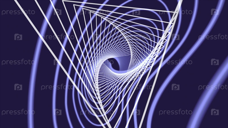Абстрактные узкие белые линии, образующие туннельные треугольники на темно-синем фоне.Бело-синяя анимация многих узких линий и волн