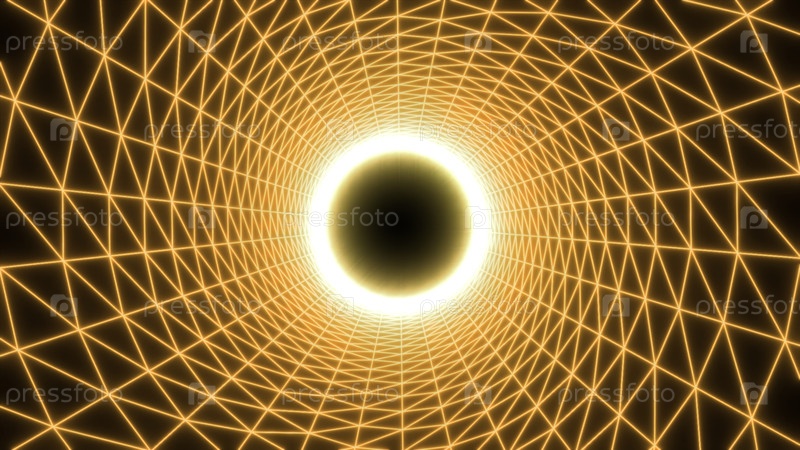 Полет внутри неонового полосатого круглого туннеля с темной пульсирующей сферой в конце.Движение. Бесконечное цифровое путешествие