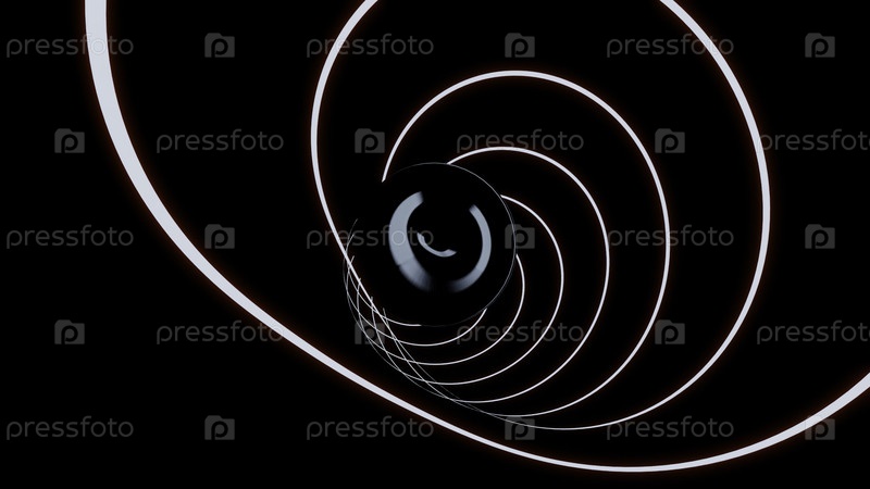 Абстрактная белая и светло-розовая изогнутая линия создает туннель с темной сферой в центре.Дизайн.Летание внутри sci fi гипнотического коридора
