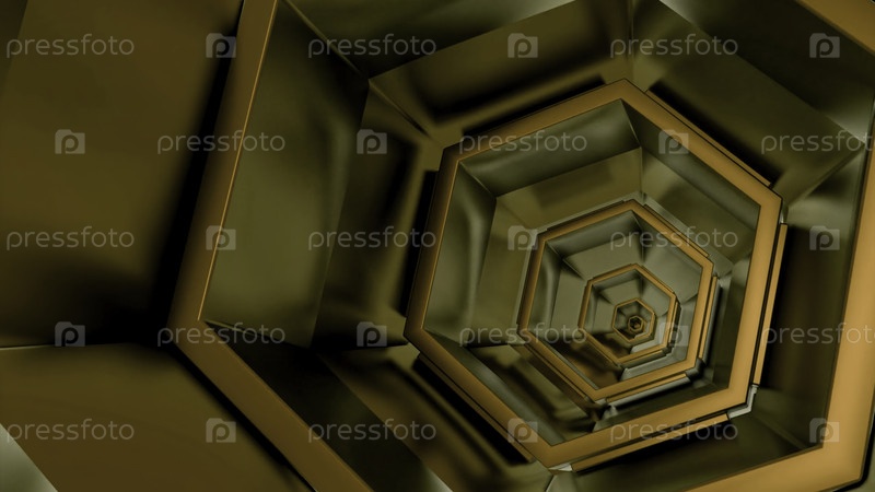 Туннель движущихся металлических шестиугольников. Дизайн. Повторяющиеся шестиугольники перемещаются в туннеле. 3D-тунел возникающих металлических шестиугольников