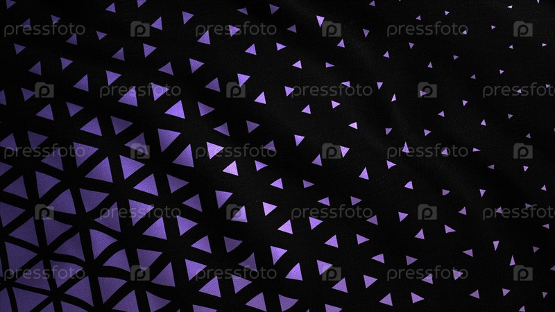 Абстрактный морщинистый черный размахивающийся флаг, покрытый фиолетовыми треугольниками. Движение. Размахивающая шелковистая текстура