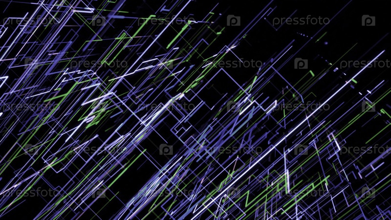 3D-геометрический рисунок на черном фонеАнимацияДвижение неоновых линий в цифровом пространствеСоздание геометрического рисунка