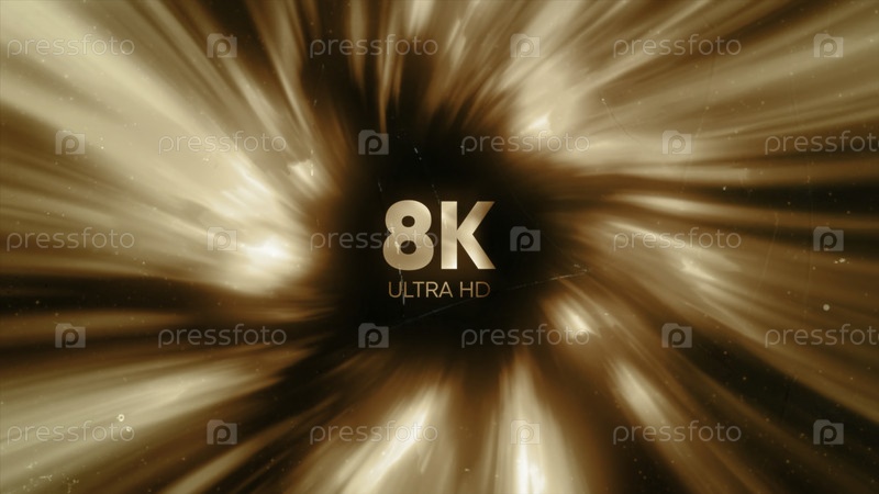 Анимация с знаком 8K. Движение. Световой круглый поток лучей со знаком 8K в центре. Анимация для отображения качества видео в разрешении 8K