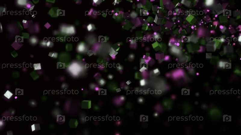 Кубические частицы образуют линию на черном фоне.Анимация.Кубы разных размеров соединены в одну линию.Поток кубических частиц, переплетенные по линии