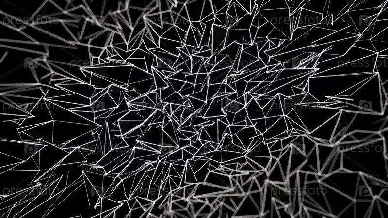 Абстрактный фон белых треугольников, вращающихся хаотично на черном фоне, бесшовная петля.Анимация летающих, крутящихся монохромных геометрических фигур, эффект разбитого стекла