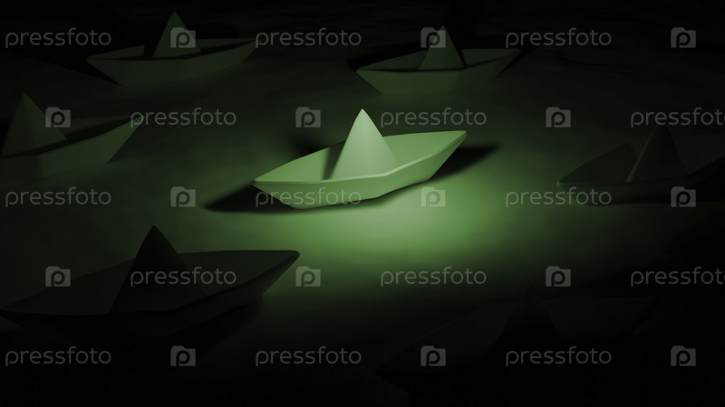 3D бумажные лодки на воде. Дизайн. Бумажные лодки движутся по поверхностным водяным волнам. Множество бумажных лодок на воде на черном фоне