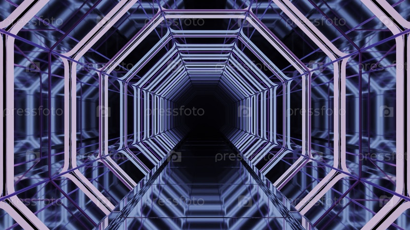 Ледяной цвет фона с летающим внутри неонового синего тоннеля. Дизайн. Коридор шестиугольных силуэтов