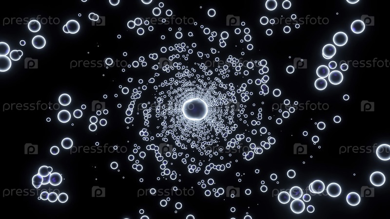 Цветные неоновые пузыри, летящие в спирали на черном фоне. Дизайн. вращающийся торнадо из небольших кругов
