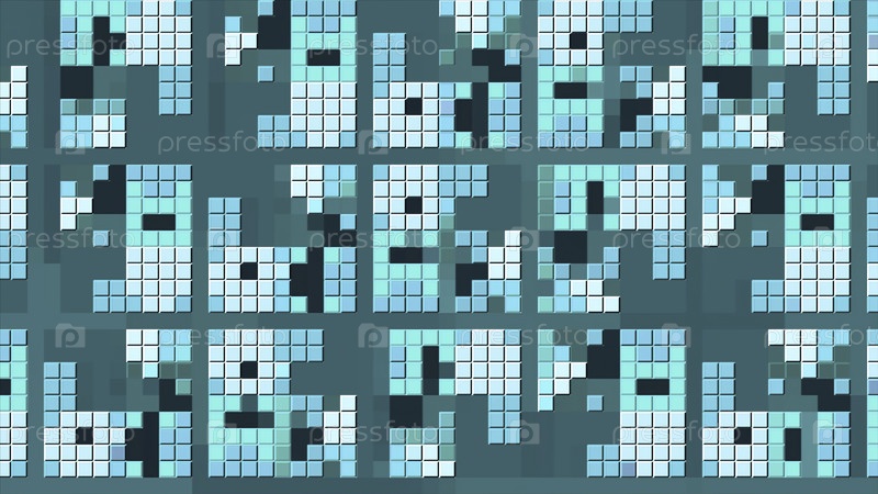 Фон с ярким рисунком пикселей, меняющимся в квадратах. Движение. Рисунок ретро-пикселя, изменяющийся в квадратах. Квадраты с движущимся изображением игры в пикселях