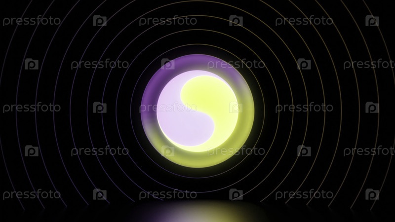 Поворачивающийся многоцветный круг на черном фоне с кольцами. Дизайн. Красивый круг вращается с кольцами на черном фоне. Круг в центре с дивергентными кольцами вокруг