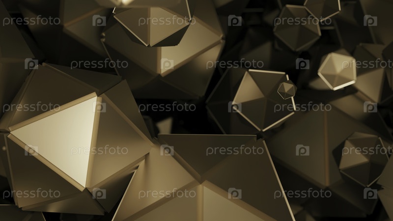 Пространство с множеством многоугольных форм. Дизайн. Многоугольные геометрические формы движутся в потоке на черном фоне. Множество геометрических 3D-форм в течение