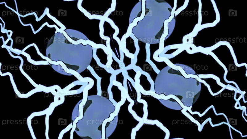 Абстрактные энергетические ядра на черном фоне, окруженные колеблющимися линиями. Дизайн. Энергетическая сфера и волнистые полосы