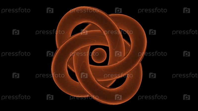 Скрученные металлические светящиеся красные трубки на черном фоне вращаются вокруг небольшой сферы. Дизайн. Металлическая запутанность, вращающаяся вокруг шара