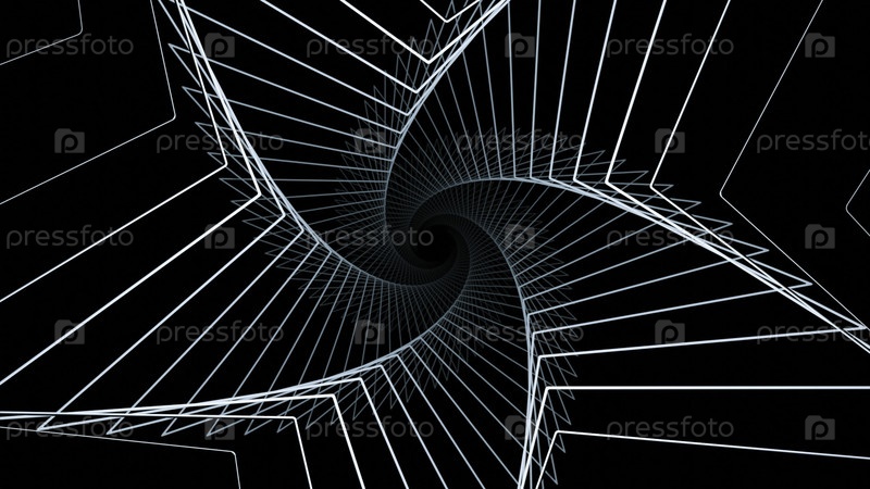 Гипнотическая 3D-спираль в форме звезды. Дизайн. Линии 3-д макета движутся по спирали на черном фоне. Спирал контурных линий в виде вращающейся звезды