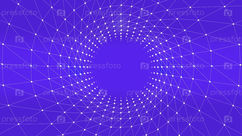 Абстрактный синий фон с белыми точками и линиями, создающими эффект туннеля. Движение. Технологический круглый коридор