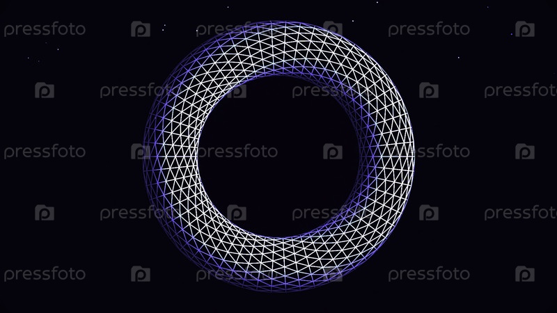 Абстрактная, синяя и белая, круговой формы геометрическая фигура вращается на черном фоне. иллюстрированный объем, прозрачное кольцевое вращение, бесшовная петля