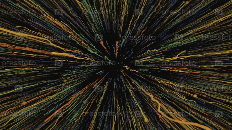 Космический поток красочных линий на черном фоне.Движение.Многие цветные линии движутся в потоке.Погрузитесь в гиперскок с разноцветными линиями