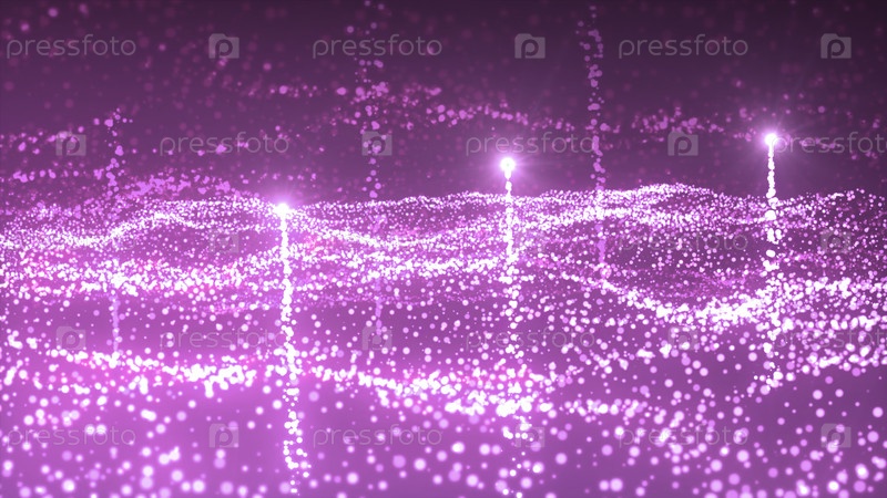 Светящиеся точки поднимаются над волнами энергии. Движение. Метеориты возникают из волнистых потоков ярких частиц. Волновые потоки энергетических частиц
