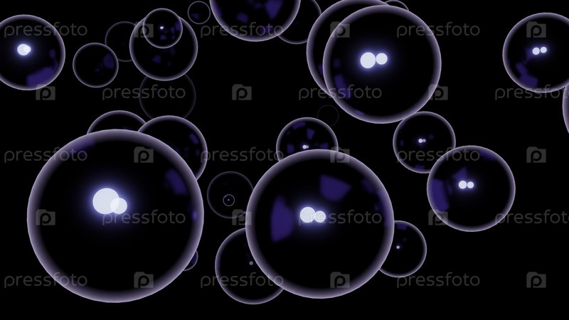 Абстрактные силуэты летающих пузырей на черном фоне.Дизайн.Летающие сферы в абстрактном пространстве