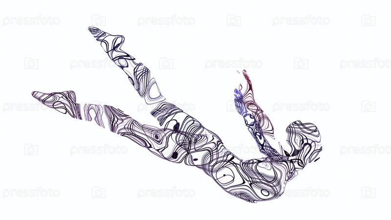 Анимация летающего силуэта женщины из линий. Дизайн. Возникающий анимированный силуэт женщины с красочными линиями. Летящая и вращающаяся фигура женщины, выполненная из линий на белом фоне