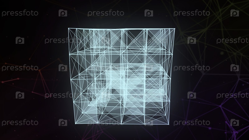 Прозрачная геометрическая форма.Движение.Темный фон, на котором тонкий белый квадрат из сетки выделяется в разных цветах.Высококачественная запись 4k