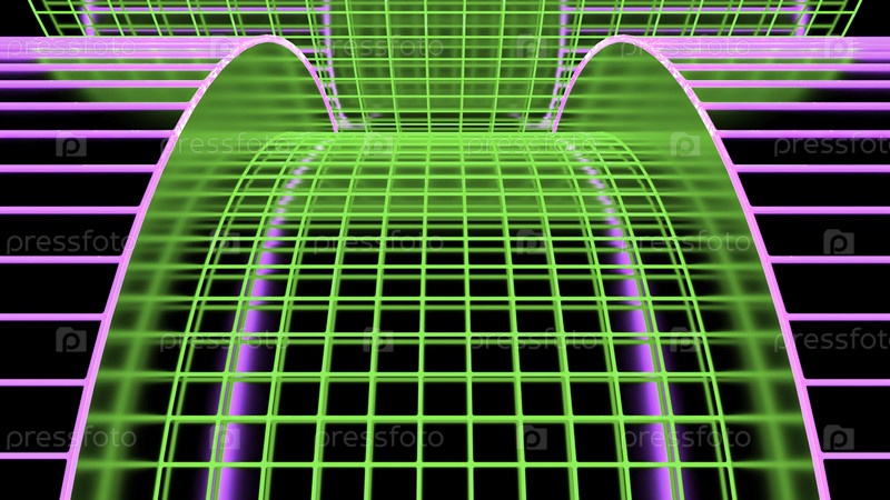 Зеленая и фиолетовая абстракция. Дизайн. Яркая неоновая дорога, которая похожа на сетку с многоцветными линиями