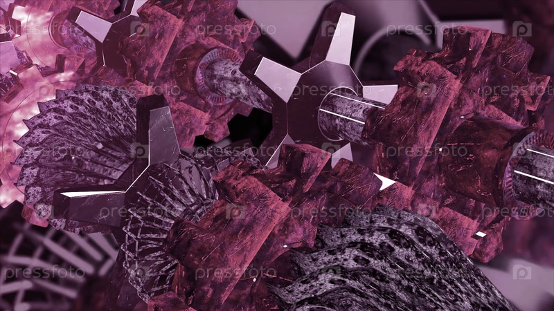 Абстрактные вращающиеся редукторы из изумрудов. Движение. Блестящий рабочий механизм, крупный план деталей машины