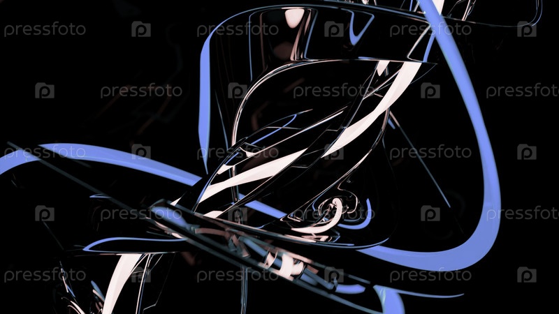 Футуристическая 3D-структура с вращающейся спиралью на черном фоне. Дизайн. Металлические абстрактные отражающие линии, которые изгибаются и протекают по диагонали