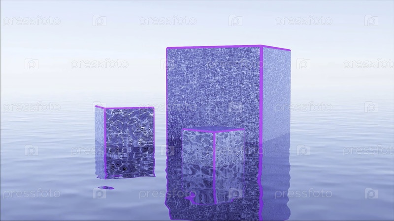 Абстрактные синие и белые кубики с розовыми силуэтами, стоящими на поверхности жидкой воды с волнами. Дизайн. Геометрическая фигура красочная абстракция