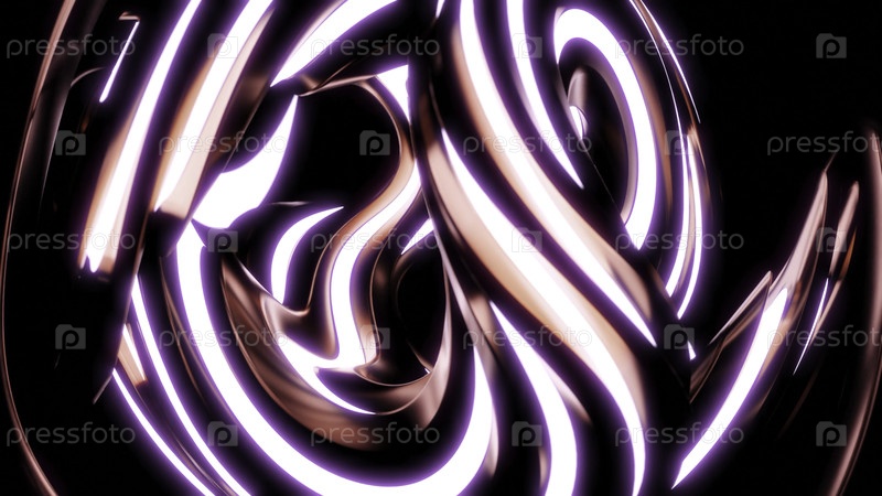 Оборачивающийся абстрактный шар с изогнутыми неоновыми линиями. Дизайн. Футуристическая структура вращается, а кривые неона проливаются на черном фоне. Абстрактный шар из изогнутых линий и светящегося неона