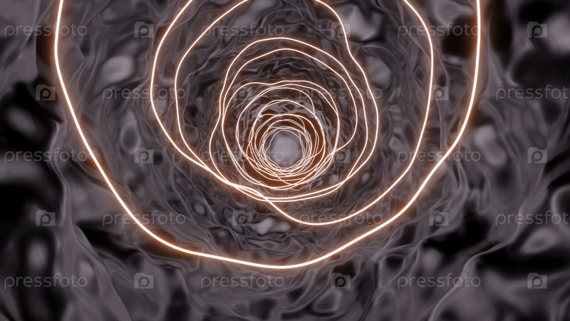 Зеленый и розовый фон.Дизайн.Светящиеся обручи, стоящие в ряд, создают коридор и яркое объемное освещение мигает с потолка в абстракции