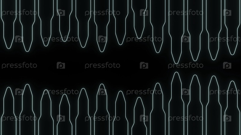 Силуэты бирюзового неона на черном фоне. Дизайн. Два ряда силуэт пуль, движущихся на черном фоне
