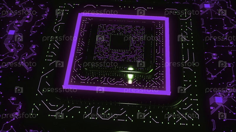 Анимация с большим 3D компьютерным чипом. Движение. Неоновая компьютерная микросхема с линиями соединения. Пирамида материнской платы компьютера с неонными линиями