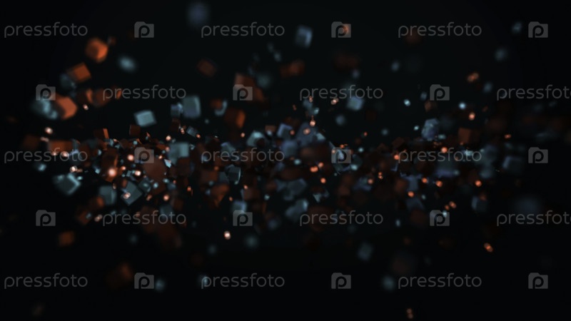 Абстрактный фон частиц, много мелких деталей и элементов, летящих в одну линию. Движущиеся красочные квадраты, образующие одну полосу, изолированную на черном фоне