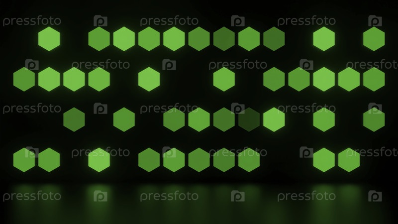 Фон мигающих шестиугольников. Дизайн. Светящиеся шестиугольники с отражением на поверхности черного фона. Геометрический фон со светящимися шестиугольниками