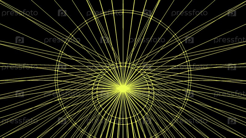 Черный фон с яркими красными и желтыми лучами.Анимация.Черный фон, на котором яркие линии создают фигуру кругов, которые летают из стороны в сторону как узоры