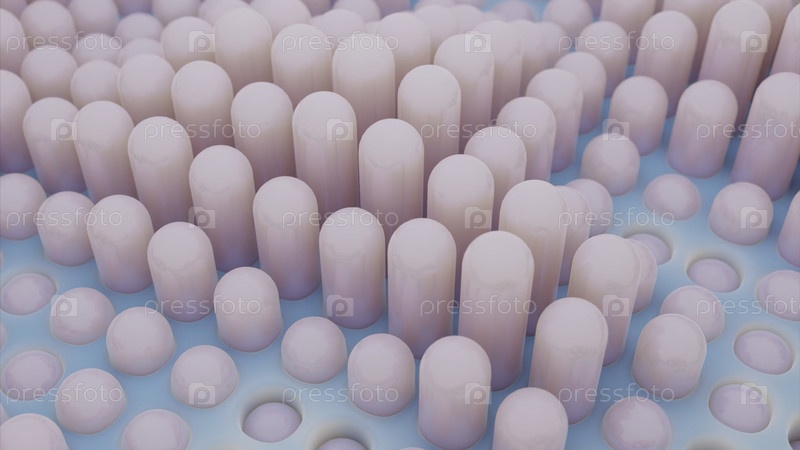 Перфорированная поверхность с прямыми трехмерными формами, движущимися вверх и вниз через отверстия. Дизайн. Волновое движение абстрактных форм