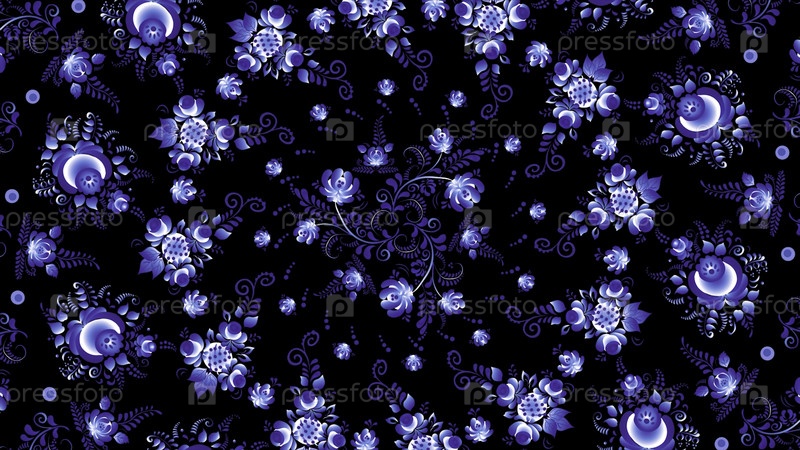 Анимация русской Хохломы.Хохлома Россия ярко-синих цветов на черном фоне