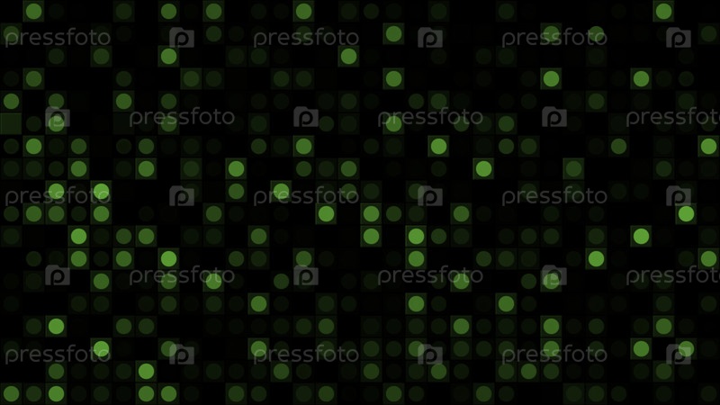 Черный фон с зелеными мигающими кругами на черном фоне.Движение.Пикселированный рисунок со случайными маленькими мигающими кружками