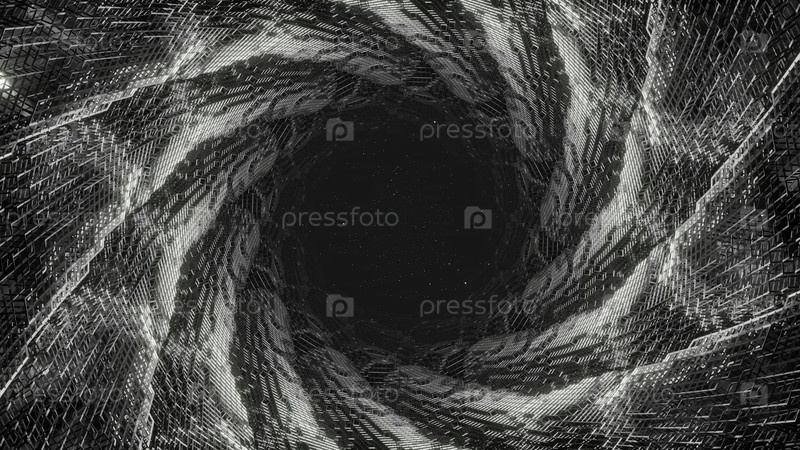 Блестящий темный туннель.Дизайн.Черный норк с искривленными 3D-линиями.Темный тоннель с вихревыми линиями из кода матрицы 3d