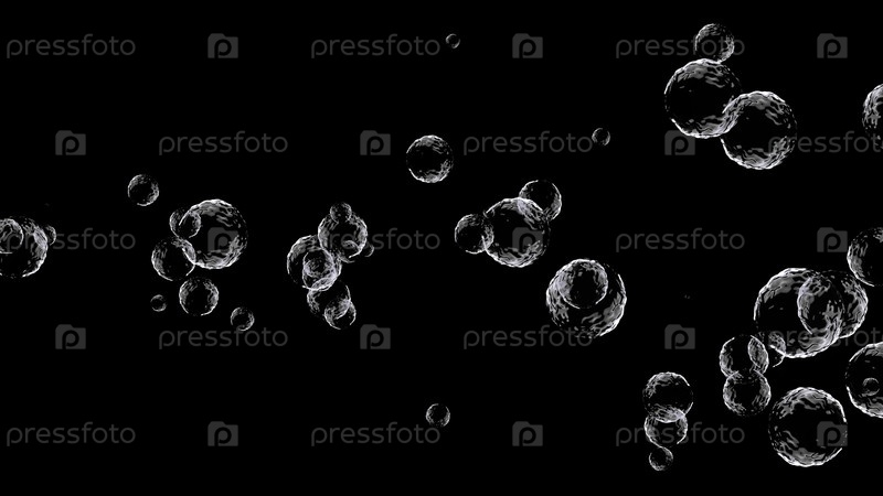 Темно-синий летающий пузырь фоном. Композиция кинофильмов с темно-синими пузырями на черном фоне. Абстрактный фон, состоящий из движущихся световых частиц
