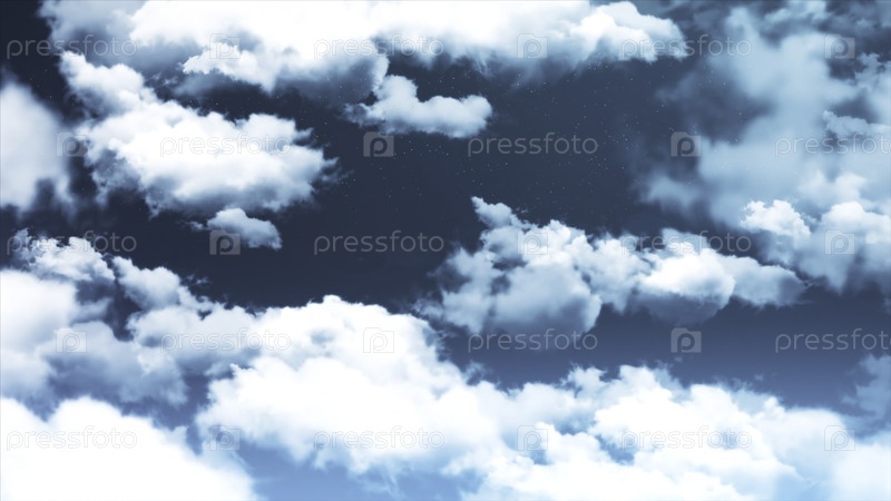 Волшебное закатное небо из сказки на светящемся звездном фоне, плавная петля.Красивые белые облака медленно текут в абстрактном голубом небе