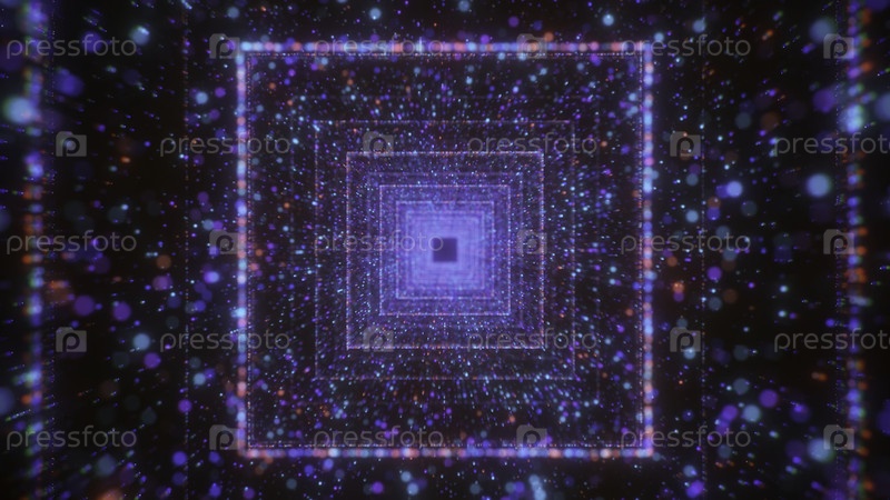 Красочные светящиеся частицы в туннеле протекают с квадратами. Движение. Прекрасный поток красочных частиц в квадратном тоннеле. Космический или виртуальный туннель с потоком частиц