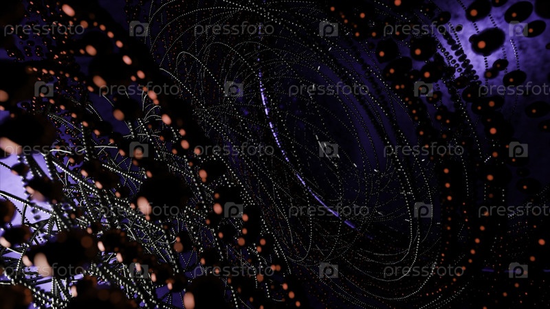 Абстрактное торнадо запутанных металлических проводов и маленьких сфер.Дизайн.Быстро вращающаяся 3D спираль