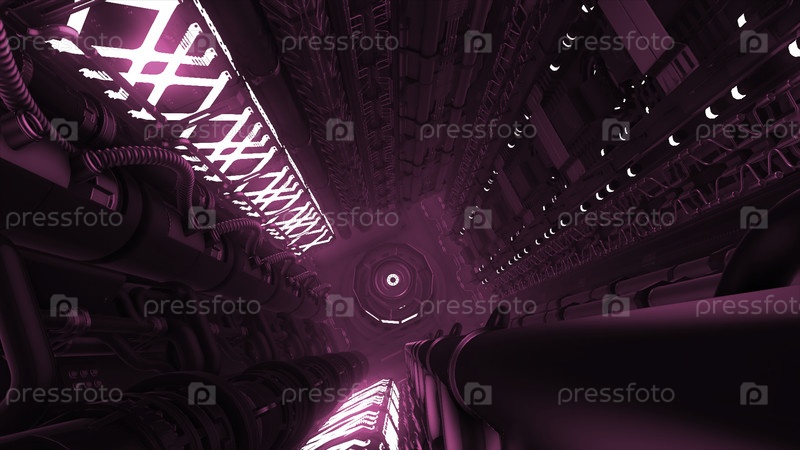 Коридор с трубами и линиями в футуристическом корабле.Движение.Туннель с неоновыми линиями и технологическими трубами.Футуристическая технология космического корабля