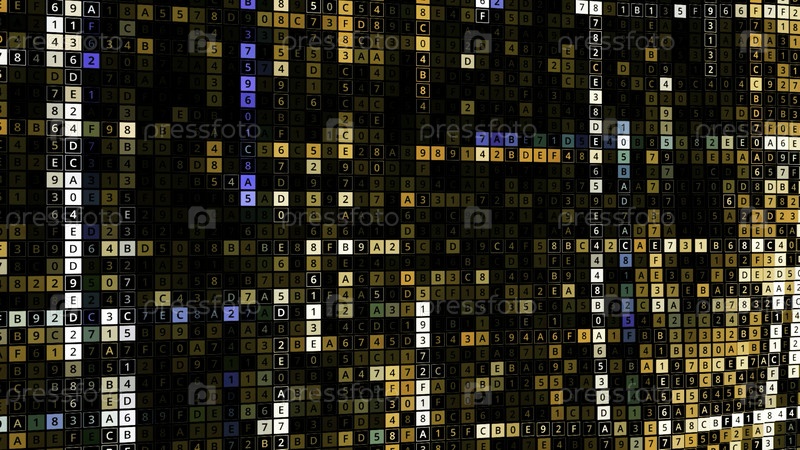 Фон с большим количеством меняющихся чисел. Анимация. Многоцветные ячейки с цифрами, которые изменяются и перемещаются в электронном поле. Яркий фон генерируемых случайных цифр и букв