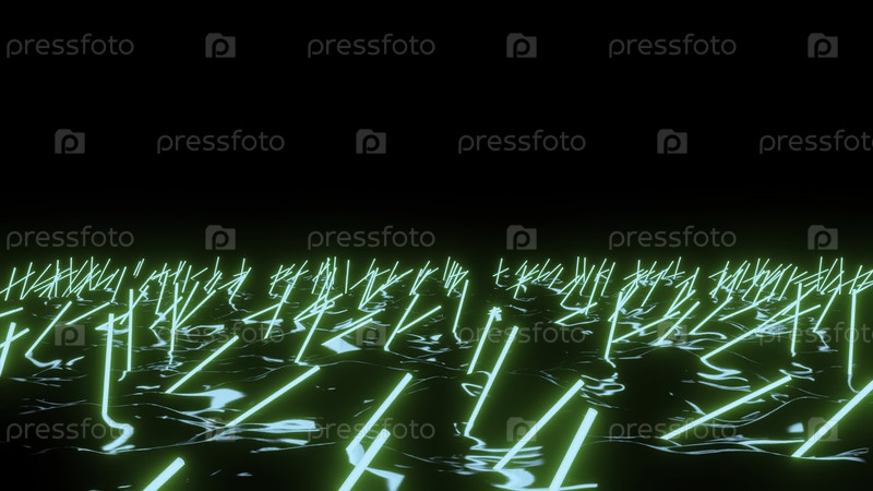 Абстрактные неоновые пятна на волнистой поверхности в темноте. Дизайн. Плавучие 3D-линии в черном абстрактном бесконечном озере